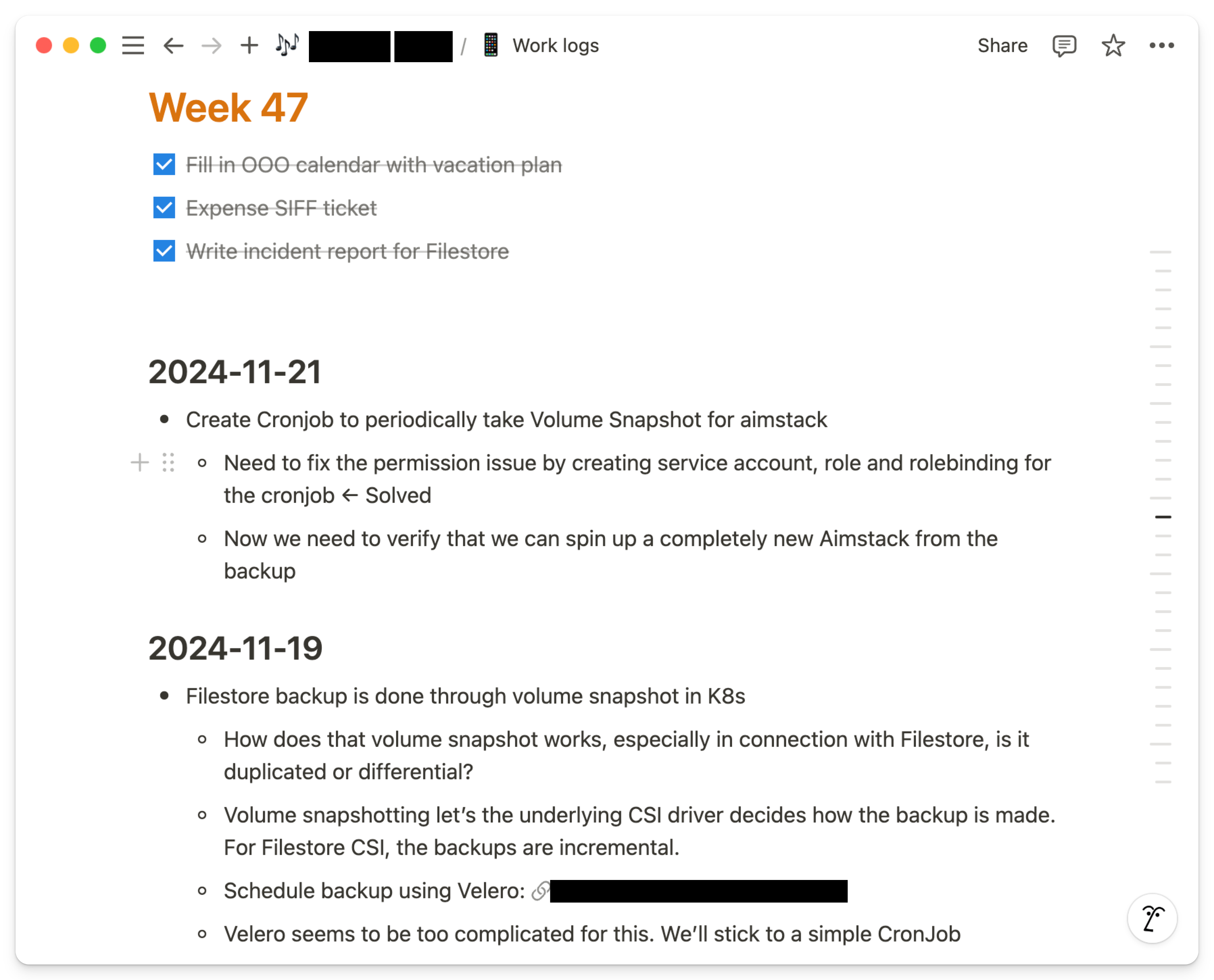 I use Notion to maintain my work logs since it’s been my go-to note-taking tool for a long time, and I genuinely enjoy using it. Its Markdown support is excellent, making it easy for me to format my logs. By keeping my work logs in this format, I can effortlessly navigate between different dates, search for specific entries, and export them whenever needed.
